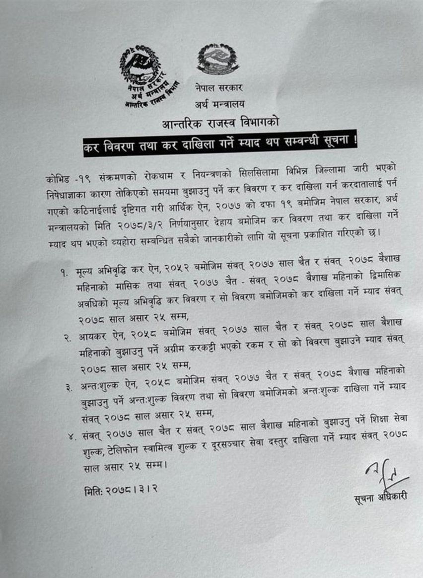 विभागले वैशाख, जेठ र असार महिनाको कर तथा विवरण असार २५ गतेसम्म तिर्दा कुनै जरिबाना नलाग्ने सूचनामा उल्लेख गरेको छ । वैशाख महिनाको भ्याट विवरण, आयकर, अन्तःशुल्क र गैरकर शीर्षकका कर तिर्ने म्याद पनि असार २५ गते नै तोकिएको छ । २५ गतेसम्म कर नतिरे जरिबाना लाग्ने विभागले जनाएको छ ।