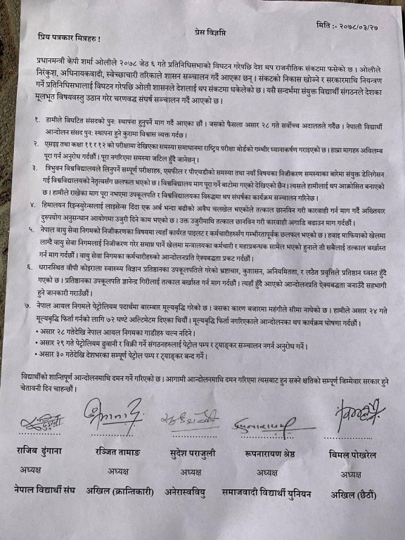 काठमाडौं, असार २७ । पाँच विद्यार्थी संगठनले पेट्रोलियम पदार्थमा गरिएको मूल्यबृद्धिको विरोधमा आन्दोलनका थप कार्यक्रम घोषणा गरेको छ ।