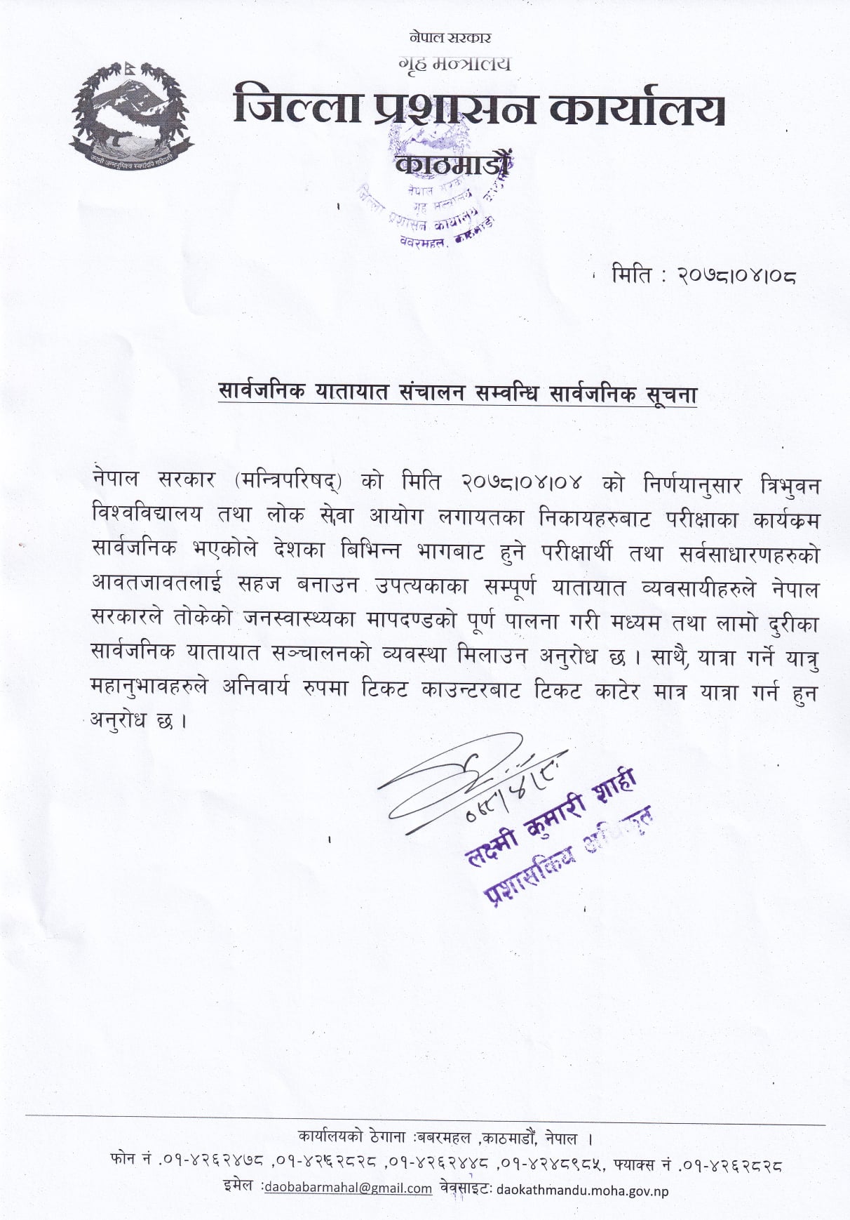 जिल्ला प्रशासन कार्यालय काठमाडौंले जारी निषेधाज्ञालाई थप खुकुलो तुल्याउँदै लामो दूरीको सार्वजनिक यातायात खुलाउने निर्णय गरेको हो ।