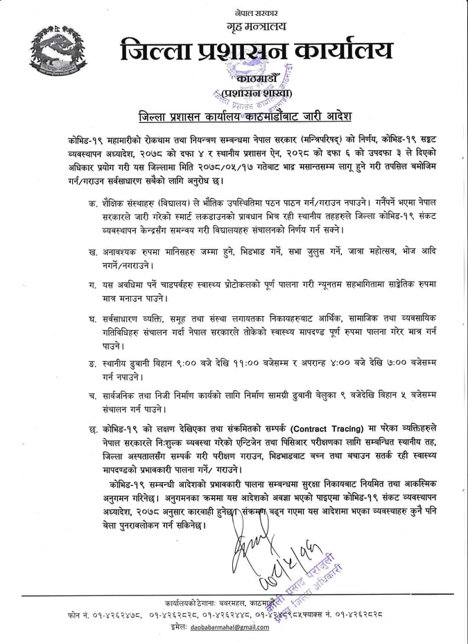 काठमाडौंका प्रमुख जिल्ला अधिकारी कालिप्रसाद पराजुलीले ‘निषेध’ शब्दलाई हटाएर आदेश जारी गरेका हुन्। ती आदेशहरू बिहीबारदेखि भदौ मसान्तसम्म लागू हुनेछन्।त्यस्तै पसल, रेष्टुरेन्ट, होटल लगायत व्यवसायहरू सञ्चालन गर्न पाइने भएको छ।