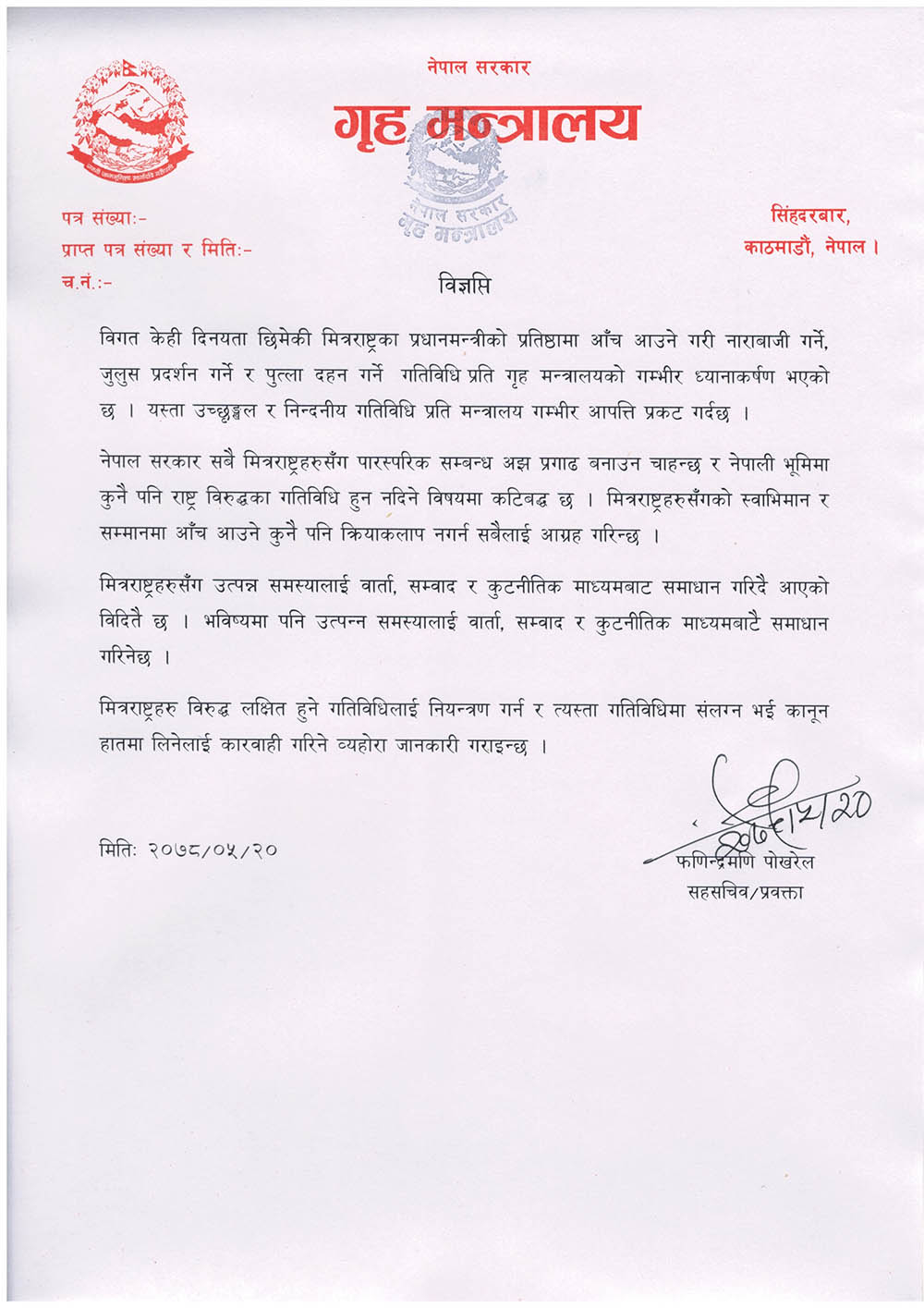 मन्त्रालयले भनेको छ, – मित्र राष्ट्रका प्रधानमन्त्रीको आँच आउने गरी नाराबाजी गर्ने,जुलुस प्रदर्शन गर्ने र पुत्ला दहन गर्ने गतिविधिप्रति ध्यानाकर्षण भएको छ । यस्ता उच्छृङ्गल र निन्दनीय गतिविधि प्रति मन्त्रालय गम्भीर आपत्ति प्रकट गर्दछ ।