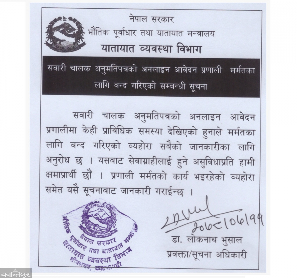 विभागले यसबारे वेबसाइटमा समेत सूचना राखेको छ । वेबसाइटमा राखिएको सूचनामा प्रणालीमा प्राविधिक समस्या देखिएकाले मर्मतका लागि आवेदन लिने कार्य बन्द गरिएको जनाइएको छ । लाइसेन्स आवेदनका लागि करिब ९ लाखले फारम भर्ने प्रयास गरेको भुसालले बताए ।