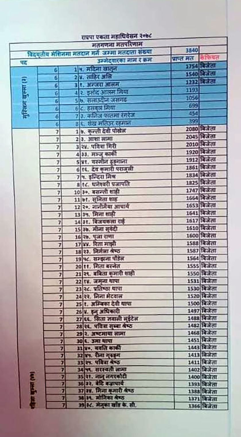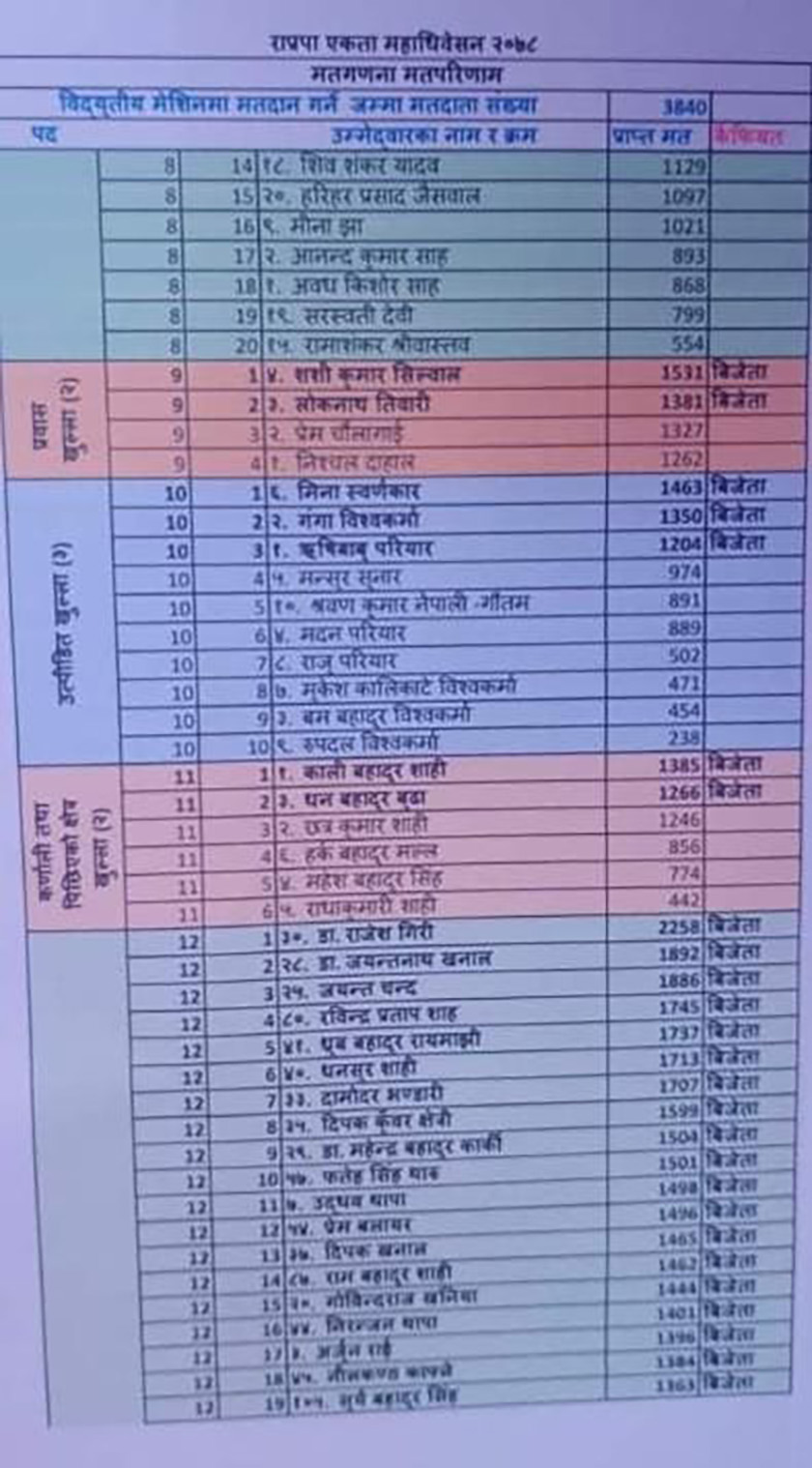 यस्तै महामन्त्रीमा डा. धवलशमशेर राणा, भुवन पाठक र कुन्ती शाही विजयी भएका छन् । राप्रपा केन्द्रीय सदस्यका उम्मेदवारको परिणाम सार्वजनिक भएको छ । केन्द्रीय सदस्यहरुमा निम्न बजोजिम निर्वाचित भएका छन् ।