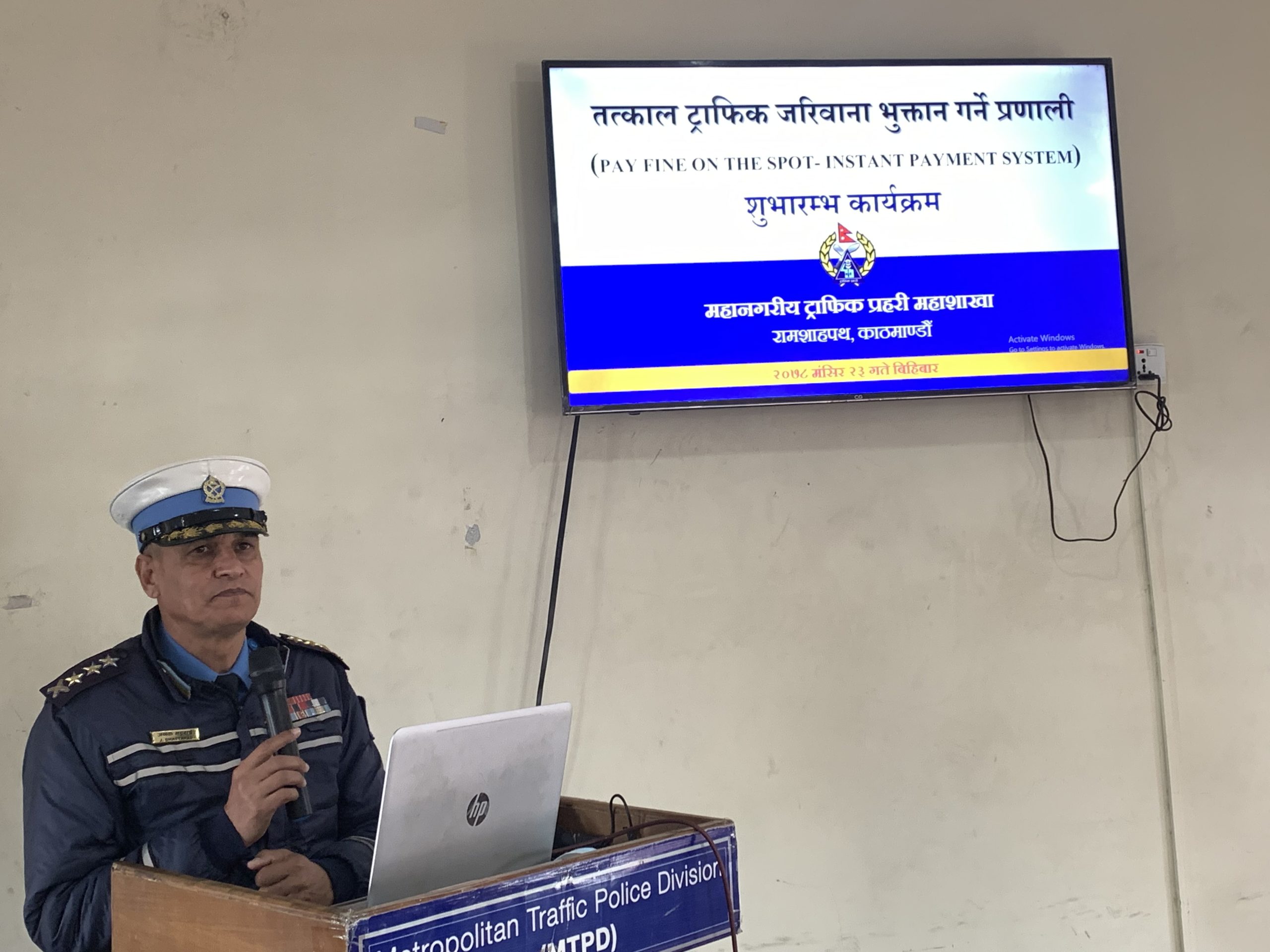 महानगरीय ट्राफिक प्रहरी महाशाखाका प्रमुख प्रहरी वरिष्ठ उपरीक्षक जनक भट्टराईले आज एक कार्यक्रमका वीच प्रविधिमा आधारित “पे फाइन अन द स्पोर्ट – इन्स्ट्यान्ट पेमेन्ट सिस्टम” व्यवस्थाको शुरुवात गर्नुभएको छ ।