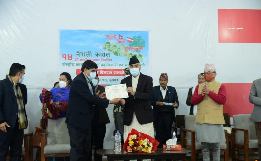 काँग्रेसका पदाधिकारीसहितका केन्द्रीय सदस्यहरुलाई प्रमाणपत्र वितरण