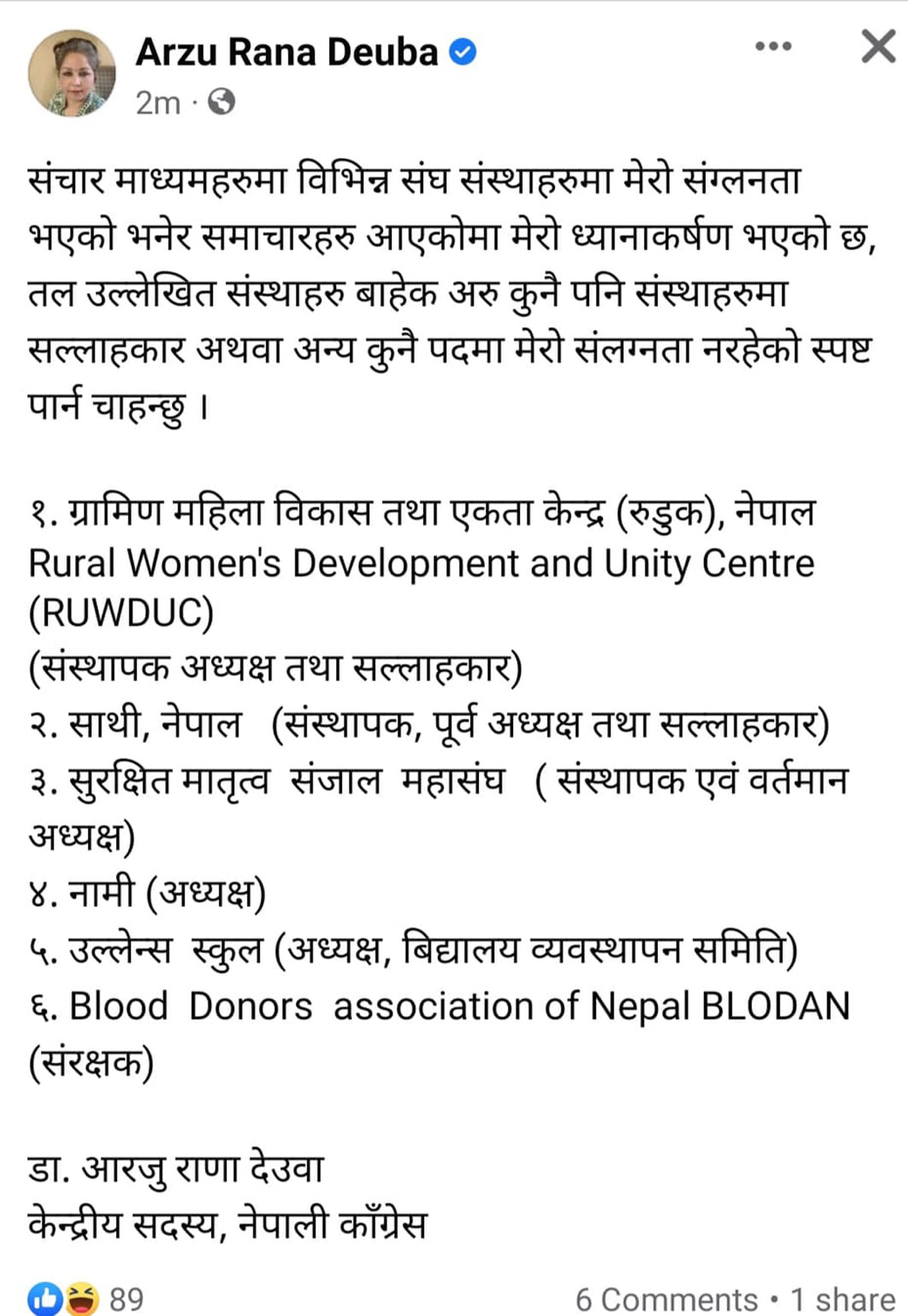 उनले फेसबुकमा आफू आवद्ध ६ वटा संस्थाको नाम र आफूले निर्वाह गरिरहेको पदीय जिम्मेवारी पनि खुलाएकी छन्।