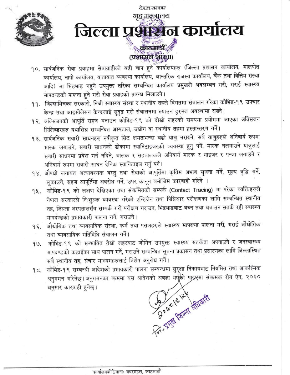 जसअनुसार घरबाट बाहिर निस्किँदा वा सार्वजनिक क्षेत्रमा हिँडडुल गर्दा मास्क अनिवार्य गरिएको छ । यसैगरी माघ १५ गतेसम्म शैक्षिक संस्थाहरू सञ्चालन गर्न पाइने छैन । २५ जनाभन्दा बढी भेला हुन पनि रोक लगाइएको छ ।