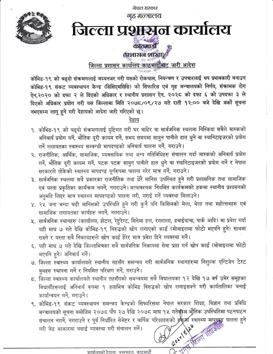 काठमाडौं उपत्यकामा स्वास्थ्य प्रोटोकलमा कडाइ, यस्तो छ प्रशासनको आदेश
