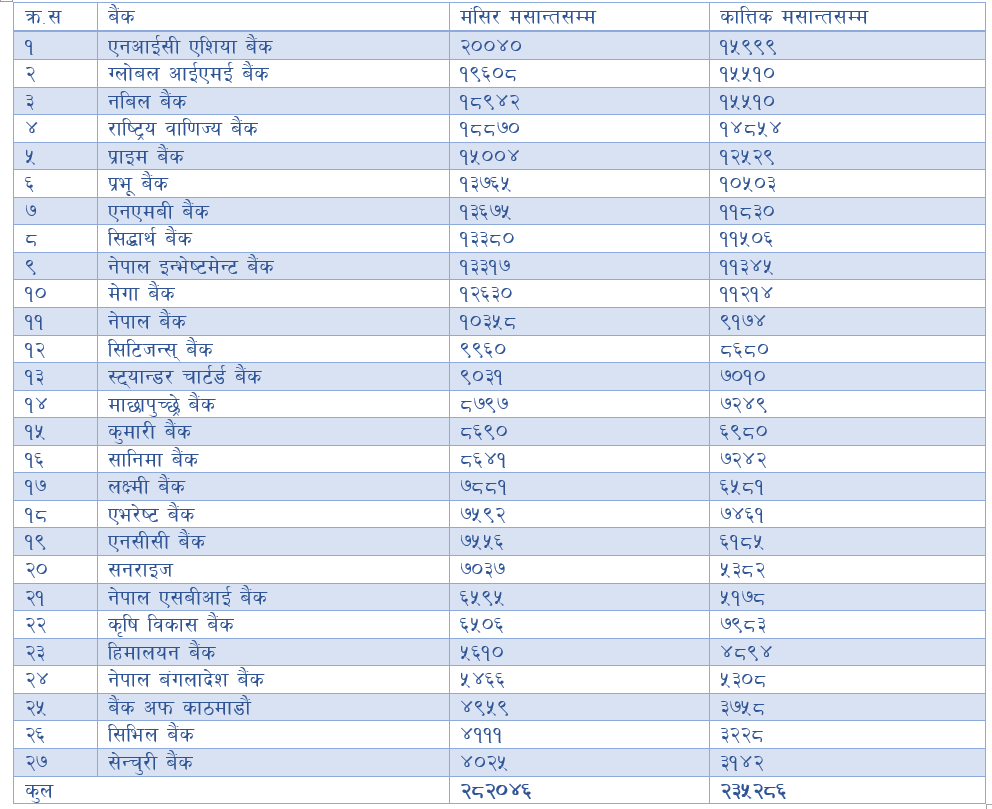गत कात्तिक मसान्तसम्म चार महिनामा बैंकहरुले २३ अर्ब ५२ करोड रुपैयाँ नाफा कमाएका थिए । एक महिनामा बैंकहरुले नाफा थप बढाएका हुन् । बैंकहरुमध्ये सबैभन्दा धेरै नाफा कमाउनेमा एनआईसी एशिया बैंक बनेको छ । बैंकले चालु आर्थिक वर्षको पाँच महिनामा २ अर्ब ४० लाख रुपैयाँ खुद नाफा आर्जन गरेको छ ।