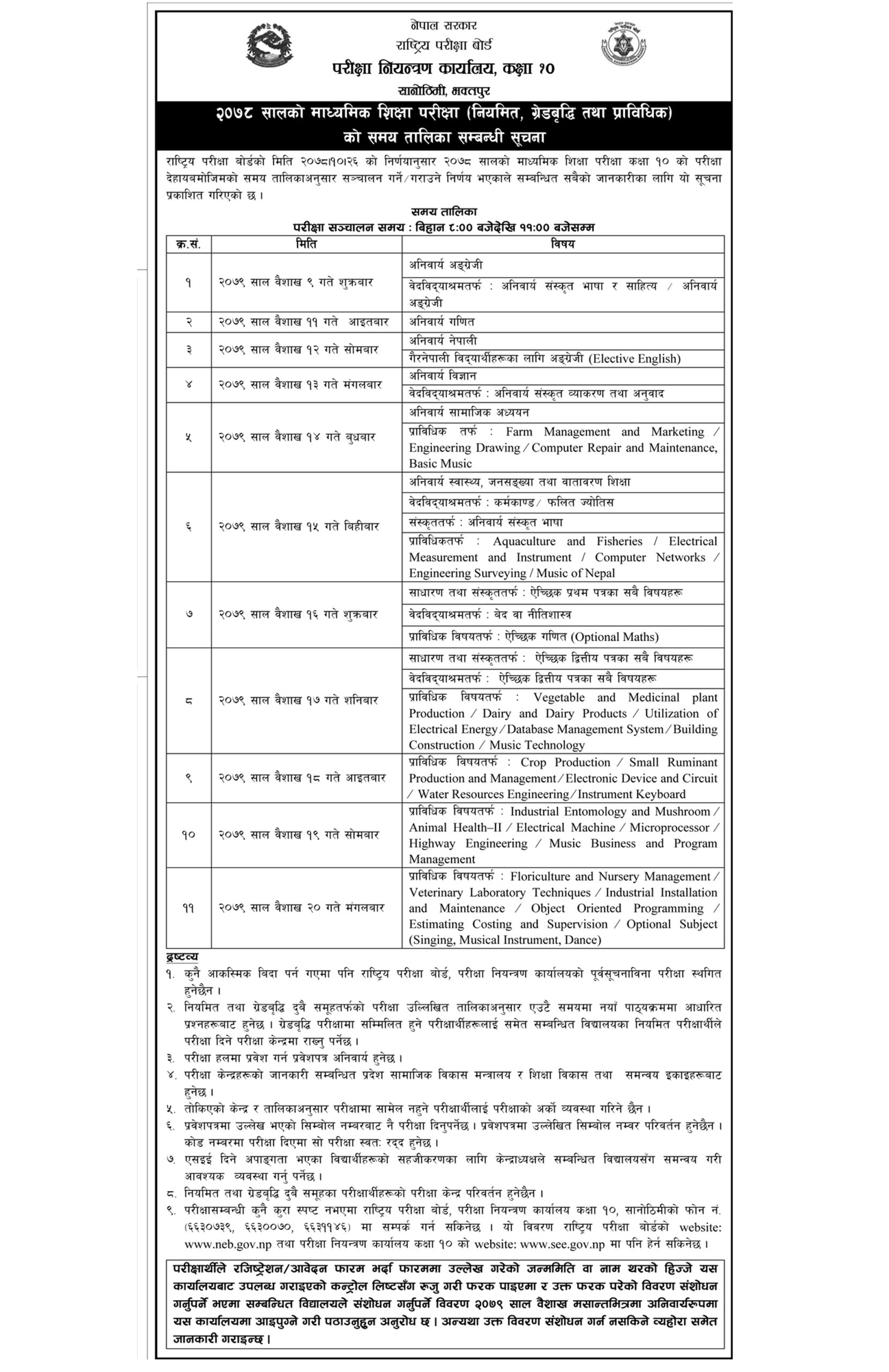 बोर्डले वैशाख ९ देखि २० गतेसम्मका लागि परीक्षाको तालिका ल्याएको छ । ११ दिन सञ्चालन हुने एसईईमा पहिलो दिन अग्रेजी र अन्तिममा प्राविधिक विषयको परीक्षा हुने छ ।