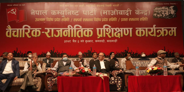 काठमाडौं, चैत २ । सत्ता साझेदार नेकपा माओवादी केन्द्रको बुधबारका लागि तय गरिएको वैचारिक तथा राजनीतिक प्रशिक्षण कार्यक्रम शुरु भएको छ । काठमाडौंको कमलादीस्थित प्रज्ञा भवनमा पार्टीको उपत्यका विशेष प्रदेश समिति, सम्पर्क समन्वय विशेष प्रदेश समिति, प्रवास समन्वय समिति वैचारिक-राजनीतिक प्रशिक्षण कार्यक्रम शुरु भएको हो ।