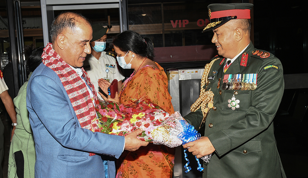 स्वदेश फिर्ता हुने क्रममा प्रधानसेनापति शर्मालाई बलाधिकृत रथी बालकृष्ण कार्कीले विमानस्थलमा स्वागत गरेका थिए। प्रधानसेनापति शर्माको सम्मानमा आइतबार जंगी अड्डामा नेपाली सेनाको टुकडीले सम्मान गारत अर्पण गर्ने कार्यक्रम रहेको छ।