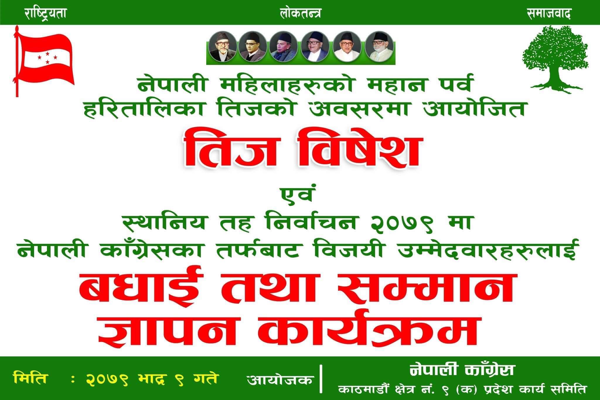 बिहिबार काठमाडौंमा नेपाली कांग्रेस क्षेत्र न. ९ (क) प्रदेशद्वारा आयोजित तीज शुभकामना आदनप्रदान तथा जनचेतना कार्यक्रममा वक्ताहरुले यस्तो धारणा व्यक्त गरेका हुन् ।