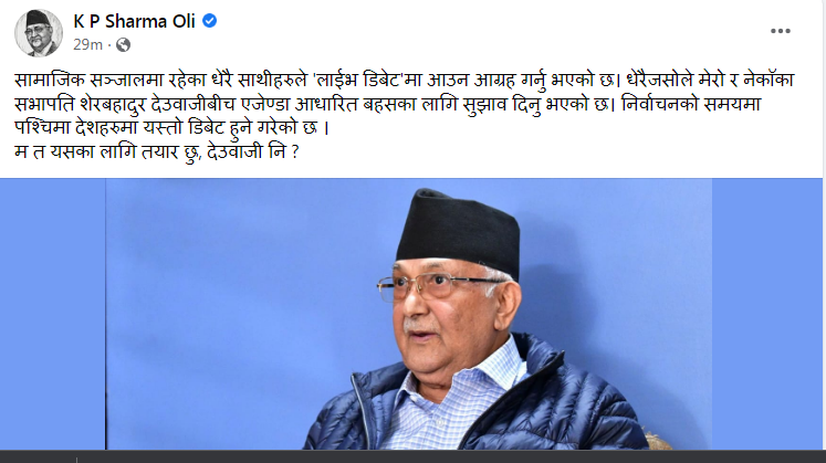 आगामी प्रदेश र प्रतिनिधिसभा निर्वाचनलाई मध्यनजर गर्दै धेरैले सामाजिक सञ्जालमा आफू र प्रधानमन्त्री देउवालाई लाभभ डिबेटमा आउन सुझाव दिएको उल्लेख गर्दै उनले त्यसका लागि आफू तयार रहेको बताएका हुन्। मंगलबार दिउँसो सामाजिक सञ्जाल फेसबुकमा स्टाटस लेख्दै पूर्वप्रधानमन्त्री ओलीले निर्वाचनका समयमा पश्चिमा देशहरूमा यस्तो डिबेट हुने गरेको उल्लेख गर्दै आफू त्यसका लागि तयार रहेको बताएका छन्।
