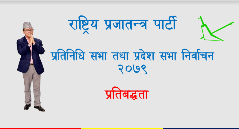 काठमाडौं, कार्तिक १४ । राष्ट्रिय प्रजातन्त्र पार्टी (राप्रपा)ले चुनावी संकल्पपत्र सार्वजनिक गरेको छ । मंसिर ४ गते हुने प्रदेश र प्रतिनिधिसभा निर्वाचनका लागि पार्टीले सोमबार घोषणापत्र सार्वजनिक गरेको हो ।