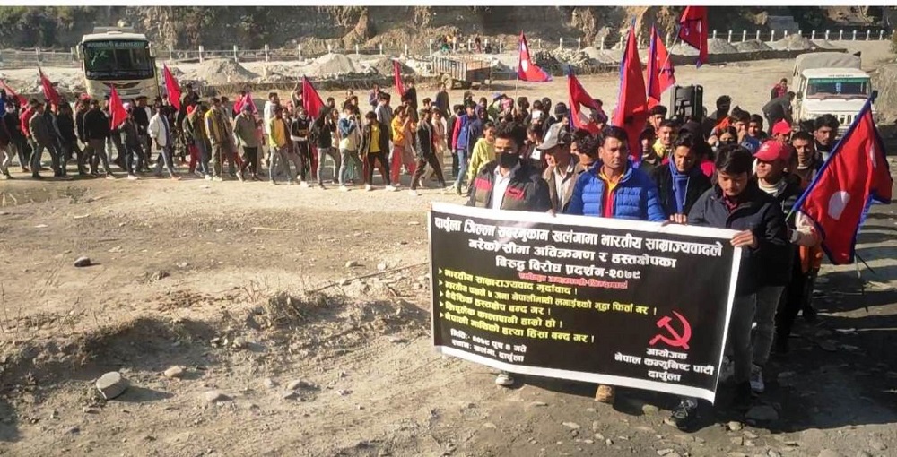 भारतले महाकाली नदीको धार नेपालतर्फ फर्काउने गरी एकतर्फी रुपमा निर्माण गरिरहेको तटबन्धको विरोध र ७ जना नेपालीमाथि लगाएको झुटा मुद्दा फिर्ताको माग गर्दै प्रदर्शन गरेको हो।