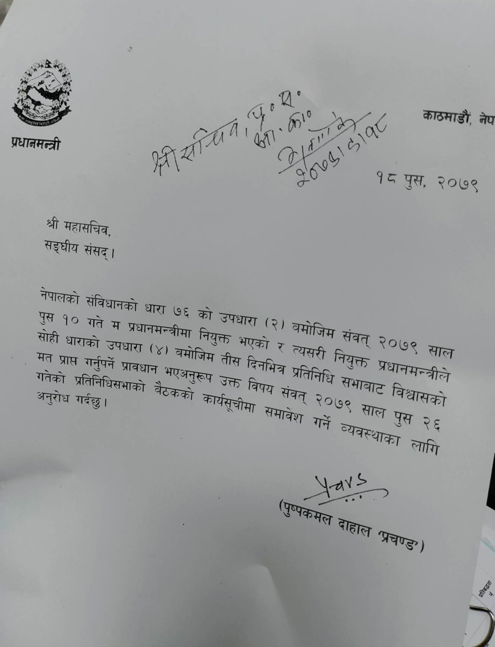 प्रधानमन्त्री दाहालले संसद्का महासचिवलाई सम्बोधन गर्दै विश्वासको मत लिने प्रयोजनका लागि व्यवस्था मिलाई दिन अनुरोध गरेका छन् । उनले २६ गतेको बैठकमा विश्वासको मत लिने कार्यसूची राखिदिन महासचिवलाई आग्रह गरेका छन् ।