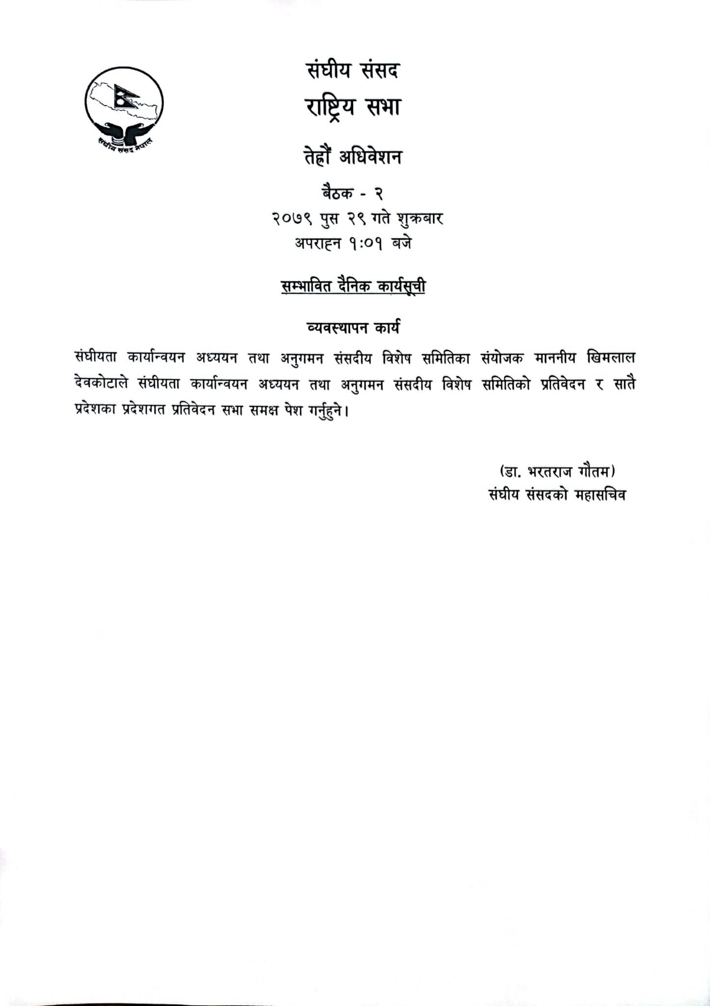 एक बुँदे सार्वजनिक सम्भावित कार्यसूचीका अनुसार संघीयता कार्यान्वयन अध्ययन तथा अनुगमन संसदीय विशेष समितिका संयोजक माननीय खिमलाल देवकोटाले संघीयता कार्यान्वयन अध्ययन तथा अनुगमन संसदीय विशेष समितिको प्रतिवेदन र सातै प्रदेशका प्रदेशगत प्रतिवेदन सभा समक्ष पेस गर्ने कार्यक्रम रहेको संघीय संसदका महासचिव डा. भरतराज गौतमले जानकारी दिए ।