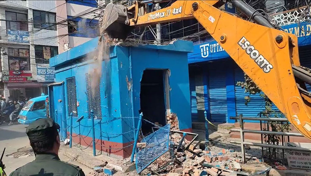 सडक अतिक्रमण गरी बनाइएको संरचना हटाउने महानगरको अभियान अन्तर्गत मंगलबार मैतीदेवी चोकमा रहेको प्रहरी बिट नगरप्रहरीले प्रहरीकै सहकार्यमा हटाएको हो ।