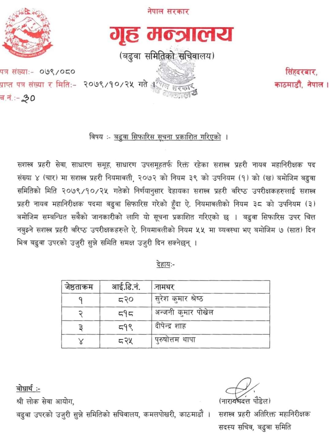बढुवा समितिका सदस्य सचिव सशस्त्र प्रहरी अतिरिक्त महानिरिक्षक (एआईजी) नारायणदत्त पौडेलका अनुसार रिक्त सो पदमा सुरेशकुमा श्रेष्ठ , अन्जनी कुमार पोखरेल, दीपेन्द्र शाह र पुरुषोत्तम थापालाई बढुवा सिफारिस गरिएको छ।