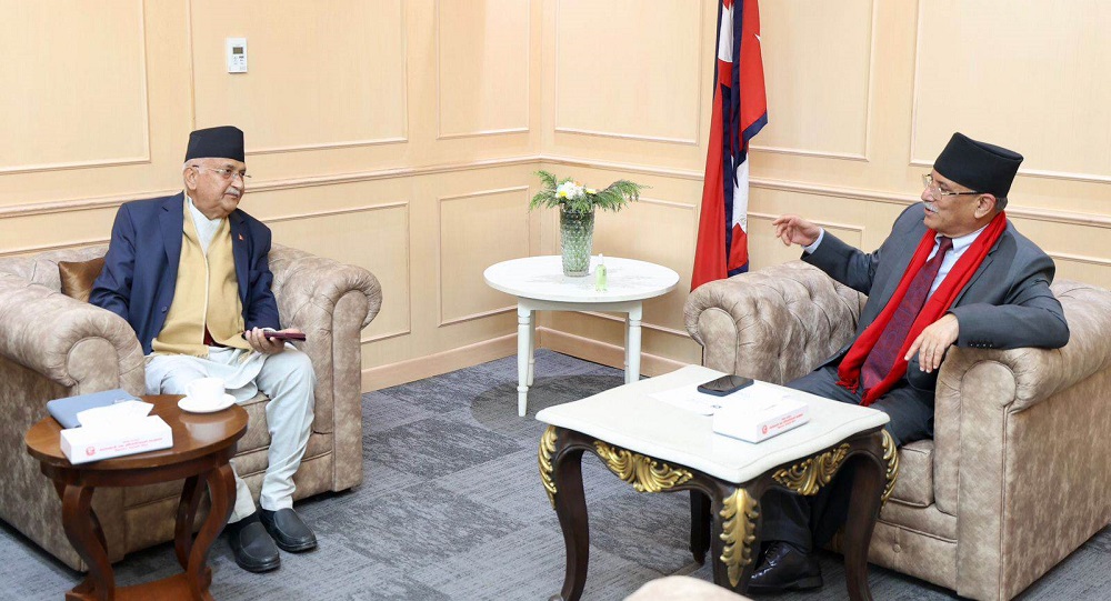 काठमाडौं, फागुन ५ । नेताहरुका अनुसार प्रमुख सत्ता साझेदार दल नेकपा एमालेका अध्यक्ष केपी शर्मा ओली राष्ट्रपतिबारे रहेको संशय मेट्ने प्रयास गर्न प्रधानमन्त्री पुष्पकमल दाहाल प्रचण्डलाई भेट्न बिहीबार प्रधानमन्त्रीको सरकारी निवास वालुवाटार गएका थिए ।