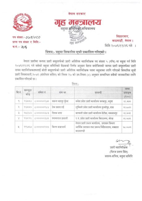 गृहमन्त्रालय अन्तर्गतको बढुवा समितिको शुक्रबारको बैठकले डीआईजीहरू वसन्तबहादुर कुँवर, टेकप्रसाद राई, दीपक थापा, श्यामलाल ज्ञवाली र किरण बज्राचार्यलाई एआईजीमा बढुवा गर्न सिफासिर गरेको हो।