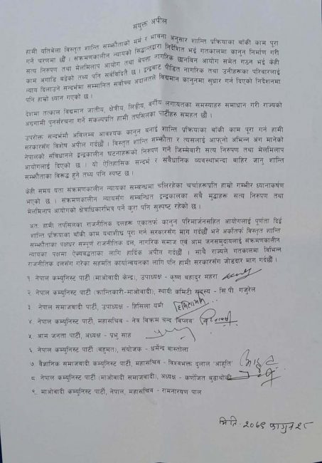 आइतबार काठमाडौंमा संयुक्त रुपमा पत्रकार सम्मेलन गर्दै नेकपा माओवादी केन्द्र, नेकपा, नेकपा क्रान्तिकारी माओवादी लगाएतका दलहरुले द्वन्द्वकालीन घटनाहरूको निरुपण गर्ने जिम्मेवारी पाएको सत्य निरुपण तथा मेलमिलाप आयोगलार्ई पूर्णता दिई शान्ति प्रक्रियाका बाँकी काम यथाशीघ्र पूरा गर्न सरकारसँग माग गरेका हुन्।