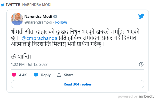 नेपालीमा ट्विट गर्दै मोदीले दिए सीता दाहाललाई श्रद्धाञ्जली