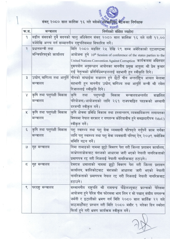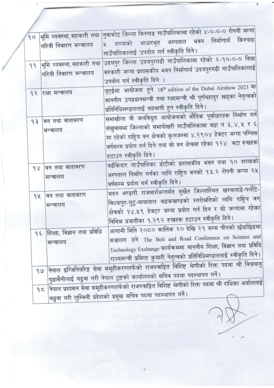 बिहीबार बसेको मन्त्रिपरिषद्को बैठकले गरेका निर्णय