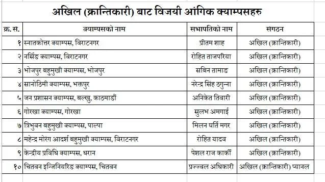 उनकाअनुसार स्नातकोत्तर क्याम्पस विराटनगर, नर्सिङ क्याम्पस विराटनगर, भोजपुर बहुमुखी क्याम्पस भोजपुर, सानोठिमी क्याम्पस भक्तपुर, जनप्रशासन क्याम्पस बल्खु, काठमाडौँ, गोरखा क्याम्पस गोरखा, त्रिभुवन बहुमुखी क्याम्पस पाल्पा, महेन्द्र मोरङ आदर्श बहुमुखी क्याम्पस विराटनगर, केन्द्रीय प्रविधि क्याम्पस धरान र चितवन इन्जिनियरिङ क्याम्पस चितवनमा क्रान्तिकारी विजयी भएको छ । अखिल क्रान्तिकारी २०७९ सालमा भएको निर्वाचनमा ३ वटा मात्र आंगिक क्याम्पसमा विजयी भएको थियो