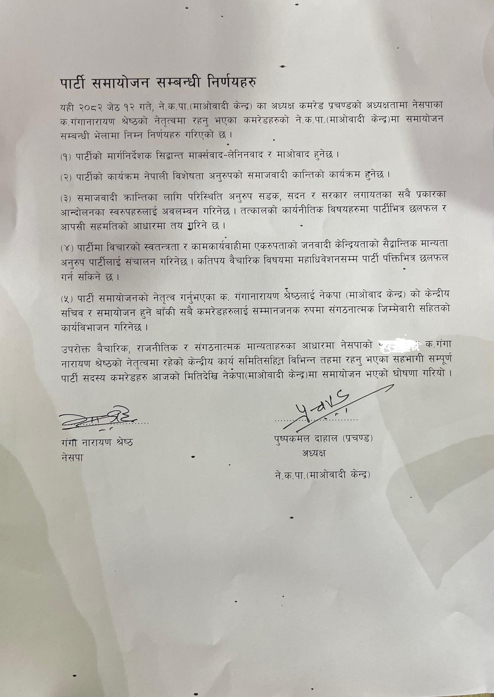 जसअनुसार गंगानारायण श्रेष्ठ नेतृत्वमा रहेको नेपाल समाजवादी पार्टीका नेता तथा कार्यकर्ताहरू माओवादीमा समायोजित भएका छन्।