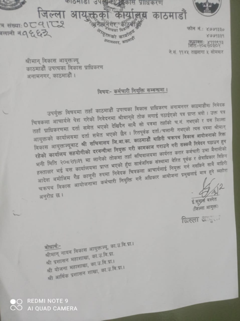 जिल्ला आयुक्त कार्यालयले कर्मचारी नियुक्ती सम्बन्धि निवेदन विकास आयुक्तको कार्यालयमा काहीं कतै दर्ता समेत नदेखिएको, चलानी नं. नभएको रित पूर्वक दर्ता भएको नदेखिएको र जिल्ला आयुक्त कार्यालयमा पनि रितपूर्वक दर्ता चलानी नभएको त्यस पत्रलाई कार्यान्वयन गर्न दवाव दिनु गैर कानूनी भएको जिल्ला आयुक्त कार्यालयले जाएको छ । यसले के देखाउँछ भने विना प्रक्रिया कार्मचारी नियुक्त गर्न दवाव दिनु कनूनी खिलाप हुनेछ ।