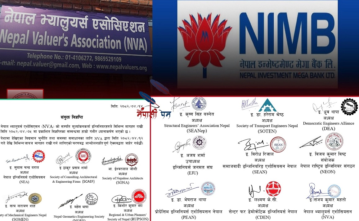 काठमाडौं, १४ साउन । सम्पत्ति मुल्यांकनकर्ता इन्जिनियरहरुको व्यवसायिक छाता संगठन नेपाल भ्यालुयर्स एशोसिएसन (एनभिए)को नेपाल इन्भेष्टमेन्ट मेगा (एनआइएमबी) बैंक बिरुद्धको आन्दोलित भएका छन् ।