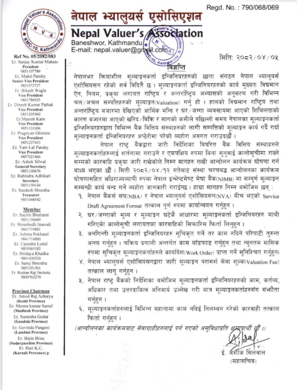 आज बुधबार संयुक्त विज्ञप्ती जारी गर्दै पन्ध्र इन्जिनियरिङ पेशासँग सम्बन्धित संघ÷संस्थाका अध्यक्षहरुले सम्पत्ति मुल्यांकन पेशामा देखिएका विद्यमान चुनौती तथा समस्या समाधानका लागि विभिन्न जायज मागहरु राखेर एनभिएले साउन १२ गतेदेखि सुरु गरेको चरणबद्ध आन्दोलनप्रति ऐक्यवद्धता जाहेर गर्दै बैंक बिरुद्धको आन्दोलित भएका हुन् ।