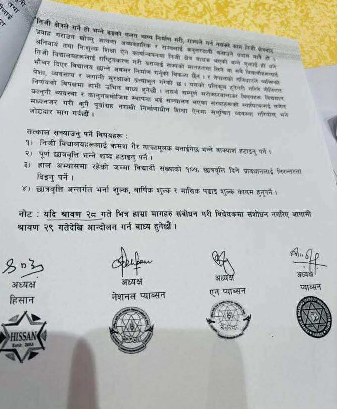हिसान, नेसनल प्याब्सन, एन प्याब्सन र प्याब्सनले आज संयुक्त विज्ञप्ति जारी गरी आफ्ना माग सम्बोधन नभए २९ गतेबाट आन्दोलन गर्ने चेतावनी दिएका हुन् । उनीहरुले निजी विद्यालयलाई क्रमशः गैरनाफामूलक बनाइने भन्ने वाक्यांश तत्काल हटाउन माग गरेका छन् ।