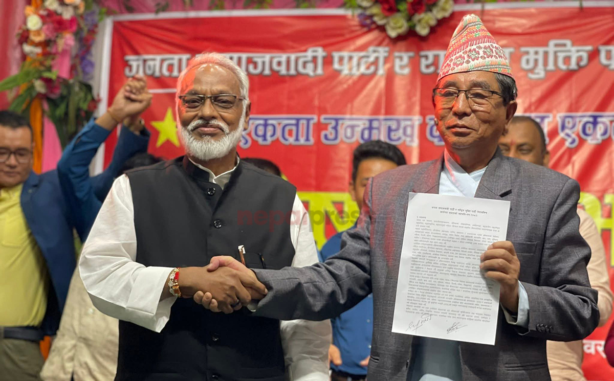 काठमाडौं, २९ साउन। अशोक राई नेतृत्वको जनता समाजवादी पार्टी र राजेन्द्र महतो नेतृत्वको राष्ट्रिय मुक्ति पार्टीबीच एकताउन्मुख कार्यगत एकता घोषणा भएको छ।