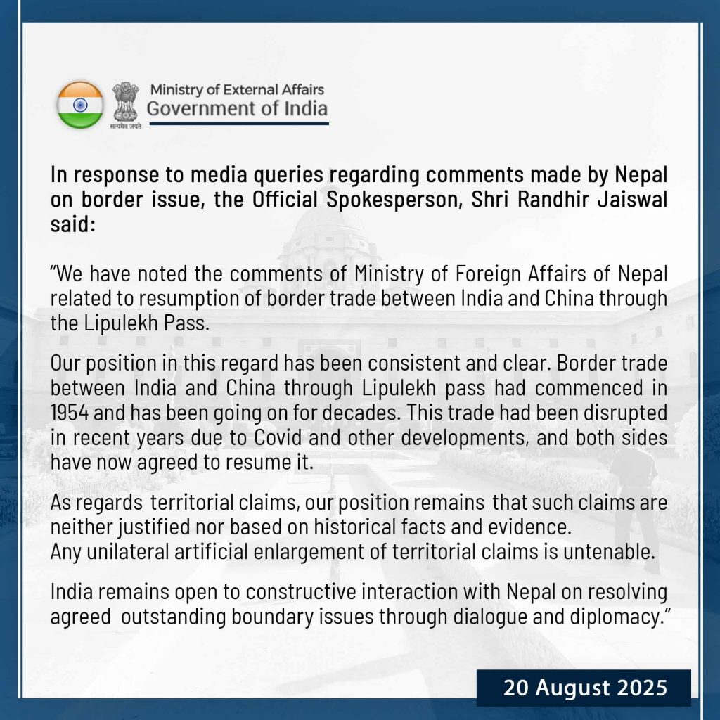 भारत सरकारको परराष्ट्र मन्त्रालयका प्रवक्ता रणधीर जैसवालले भारत र चीनकोबीचमा सन् १९५४ देखि नै लिपुलेकमार्ग हुँदै व्यापार हुने गरेको दाबी गरेका छन् ।