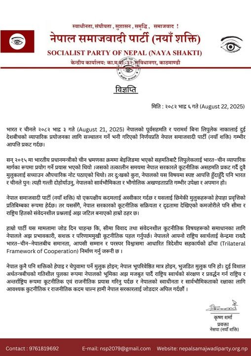 ‘भारत र चीनले भाद्र ३ गते नेपालको पूर्वसहमति र परामर्श बिना लिपुलेक नाकालाई दुई देशबीचको व्यापारिक प्रयोजनका लागि सञ्चालन गर्ने भनी गरिएको निर्णयप्रति नेपाल समाजवादी पार्टी (नयाँ शक्ति) गम्भीर आपत्ति प्रकट गर्दछ’, विज्ञप्तिमा भनिएको छ ।