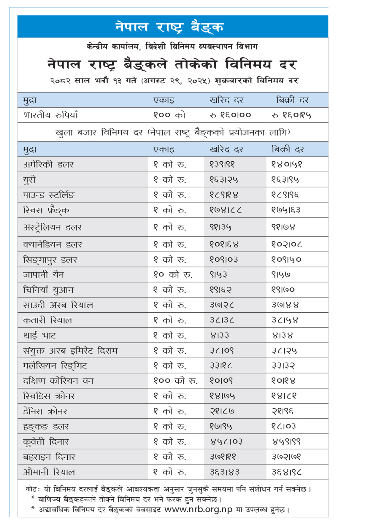 राष्ट्र बैंकले यो विनिमयदरलाई आवश्यकतानुसार जुनसुकै समयमा पनि संशोधन गर्न सकिने जनाएको छ । वाणिज्य बैंकले तोक्ने विनिमयदर भने फरक हुनसक्ने र अद्यावधिक विनिमयदर केन्द्रीय बैंकको ‘वेबसाइट’ मा उपलब्ध हुने जनाइएको छ ।