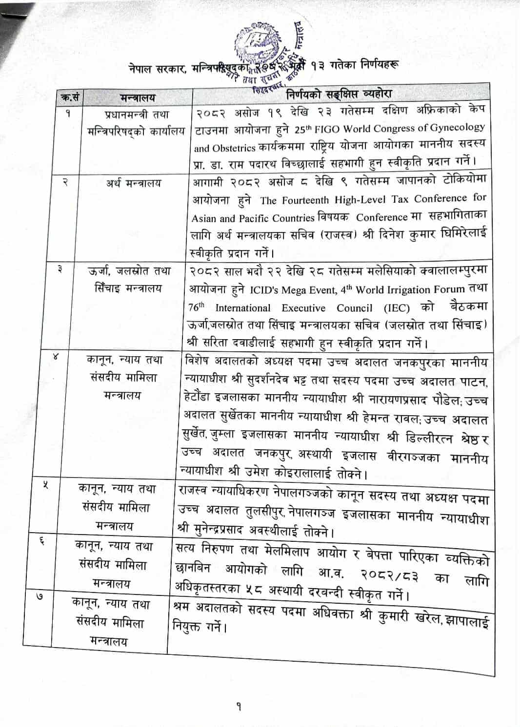 जसअनुसार विशेष अदालतको अध्यक्ष पदमा उच्च अदालत जनकपुरका न्यायाधीश सुदर्शन भट्टलाई तोकिएको छ । यस्तै सत्य निरूपण तथा मेलमिलाप आयोग र बेपत्ता पारिएका व्यक्तिको छानबिन आयोगका लागि अस्थायी दरबन्दी स्वीकृति गर्ने, श्रम अदालतको सदस्य पदमा अधिवक्ता कुमारी खरेललाई नियुक्त गर्नेसहितका निर्णय भएको गुरुङले जानकारी दिए ।