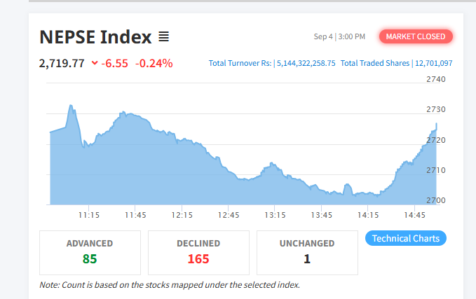 काठमाडौं,१९ भदौ । बिहीबार सेयर बजार अघिल्लो दिनको तुलनामा ६.५५ अंक घटेको छ । सो गिरावटपछि नेप्से २७१९ मा कायम भएको छ । दिनभर निरन्तर घटेको बजार अन्तिम ४० मिनेटमा सम्हालिएर बन्द भएको छ ।