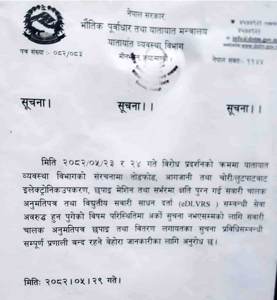 ‘सवारी चालक अनुमतिपत्र तथा विद्युतीय सवारी साधन दर्ता सम्बन्धी सेवा अवरुद्ध हुन पुगेको विषम परिस्थितिमा अर्को सूचना नभएसम्मको लागि सवारी चालक अनुमतिपत्र छपाइ तथा वितरण लगायतका सुचना प्रविधिसम्बन्धी सम्पूर्ण प्रणाली बन्द रहने बेहोरा जानकारीका लागि अनुरोध छ,’ विभागको सूचनामा भनिएको छ ।
