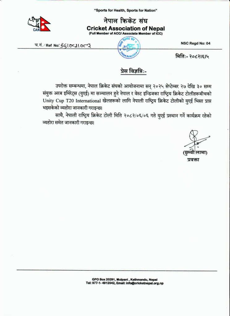 नेपालले २७, २९ र ३० सेप्टेम्बरमा तीनवटा टी २० म्याच वेस्ट इन्डिजसँग खेल्नेछ । प्रतियोगिताको सबै खर्च र व्यवस्थापन नेपाल क्रिकेट संघको हुनेछ ।