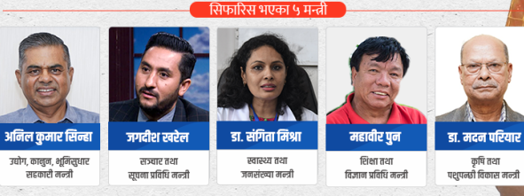 प्रधानमन्त्री सुशीला कार्कीले आइतबार अनिल कुमार सिन्हा, महावीर पुन, मदन परियार, संगीता कौशल मिश्रा र जगदीश खरेललाई मन्त्री नियुक्त गर्न सिफारिस गरेकी थिइन् । तर मिश्राको विषयमा प्रश्न उठेपछि उनको भने आज शपथ हुने नहुने निश्चित भइनसकेको शीतल निवास स्रोतले जनाएको छ ।