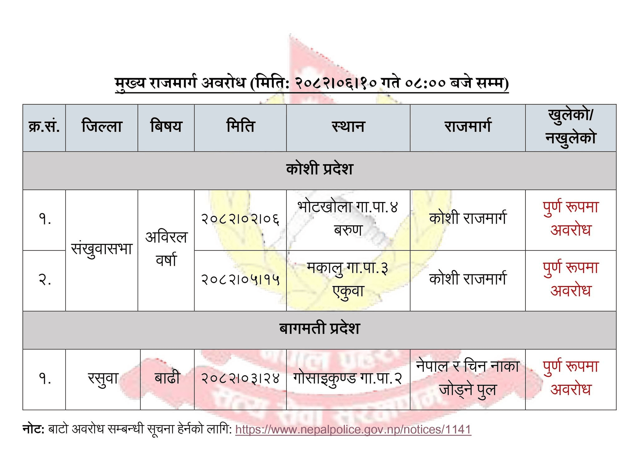 निरन्तर वर्षाका कारण आएको पहिरोका कारण कोशी राजमार्गअन्तर्गत सङ्खुवासभाको भोटखोला गाउँपालिका–४, वरुण स्थित सडक अवरुद्ध भएको छ। कोशी राजमार्गकै मकालु गाउँपालिका–३, एकुवामा पनि पहिरोले सडक अवरुद्ध भएको छ ।