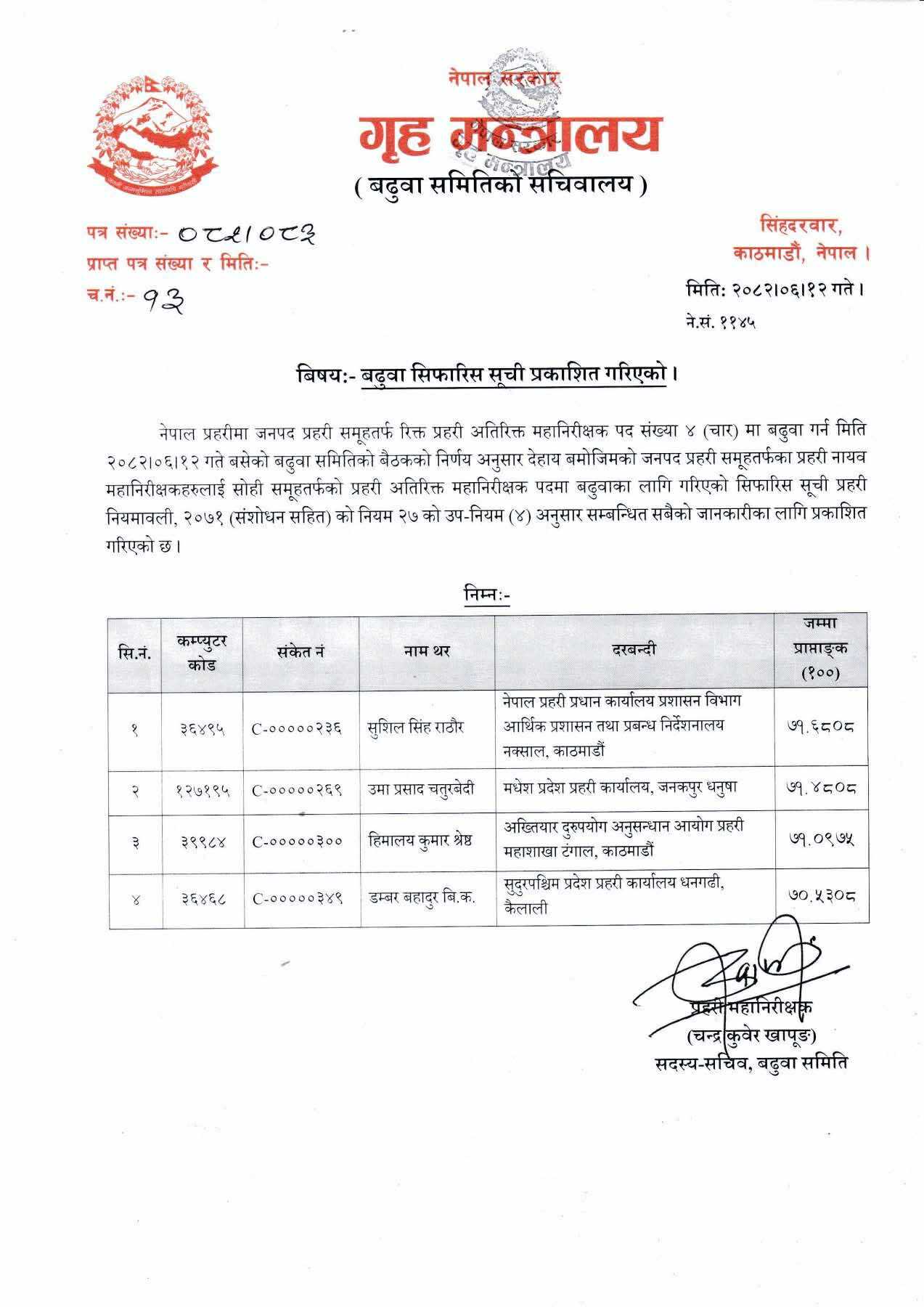 राठौरलाई नेपाल प्रहरी प्रधान कार्यालयको प्रशासन विभाग आर्थिक प्रशासन तथा प्रबन्ध निर्देशनालय नक्सालमा सिफारिस गरिएको छ। चतुरवेदीलाई मधेश प्रहरी कार्यालय, जनकपुरधाम, श्रेष्ठलाई अख्तियार दुरुपयोग अनुसन्धान आयोग प्रहरी महाशाखा टंगाल तथा विकलाई सुदूरपश्चिम प्रदेश प्रहरी कार्यालय धनगढी कैलालीमा दरबन्दी सिफारिस गरिएको छ।