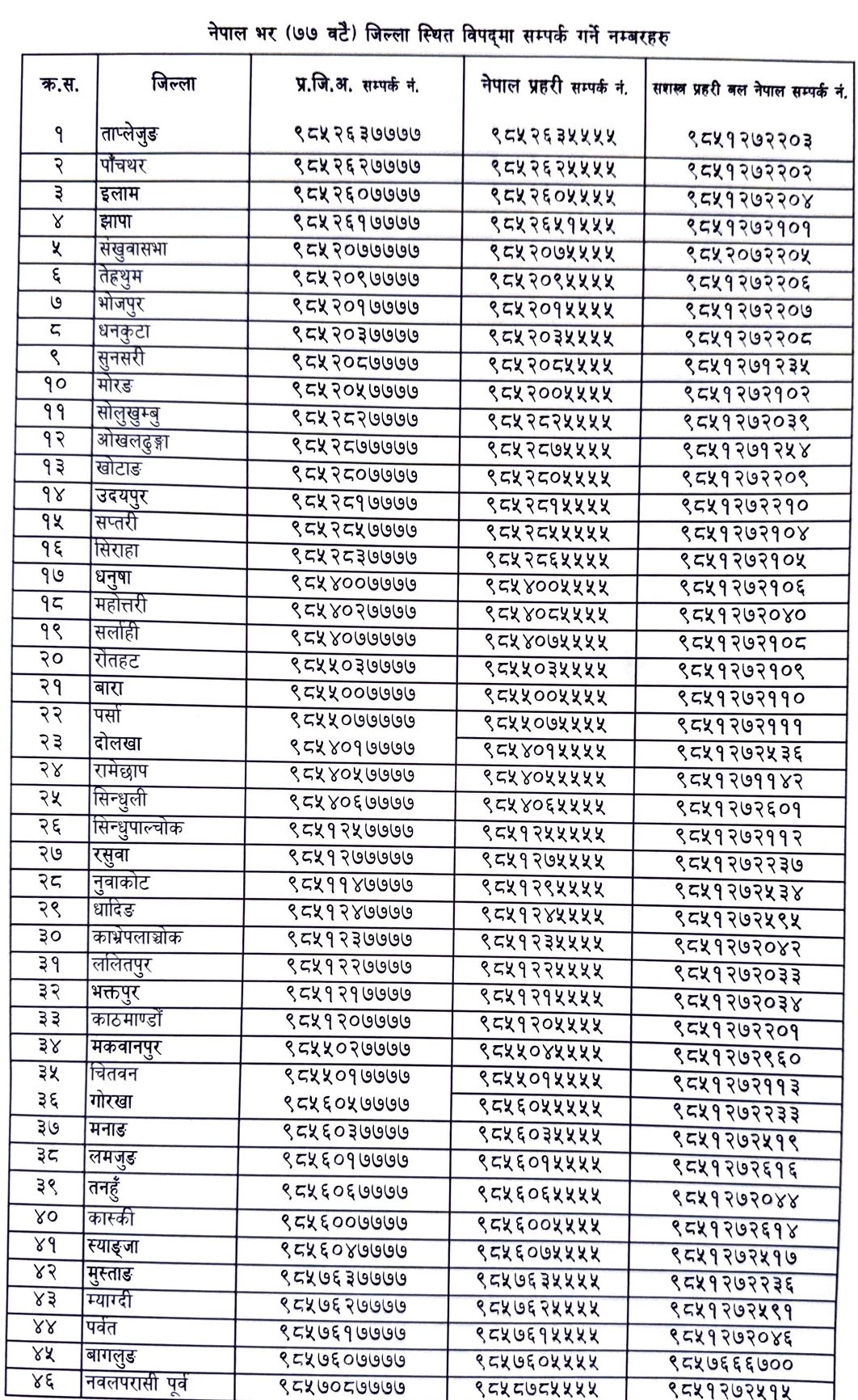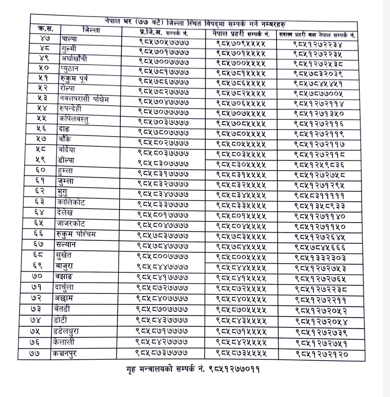 त्यसका लागि ७७ जिल्लाका स्थानीय प्रशासन र सुरक्षा निकायहरूको फोन नम्बर सार्वजनिक गरेको छ ।