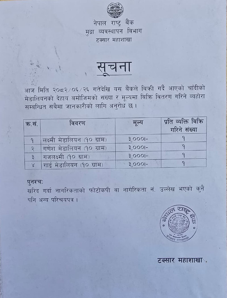काठमाडौं, २८ असोज । नेपाल राष्ट्र बैंकले चाँदीको मेडालियन (सिक्का)को मूल्य र परिमाण तोकेको छ ।
