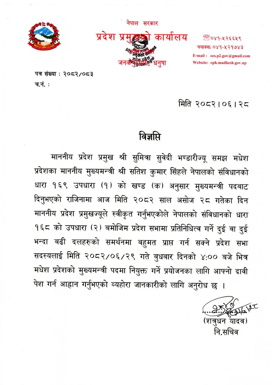 मुख्यमन्त्री सतिशकुमार सिंहले मंगलबार दिएको राजीनामा स्वीकृत गर्दै प्रदेश प्रमुख सुमित्रा सुवेदीले नयाँ सरकार गठनका लागि आह्वान गरेकी हुन् ।