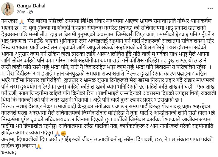 काठमाडौं, ३ कार्तिक । नेकपा माओवादी केन्द्रका संयोजक पुष्पकमल दाहाल प्रचण्डकी छोरी गंगा दाहालले सचिवालयबाट राजीनामा दिएकी छिन् । आफूलाई देखाएर निरन्तर बुवा प्रचण्ड र सिंगो पार्टीविरुद्ध प्रहार भएका कारणले आफूले राजीनामा दिएको गंगाले बताएकी छिन् ।